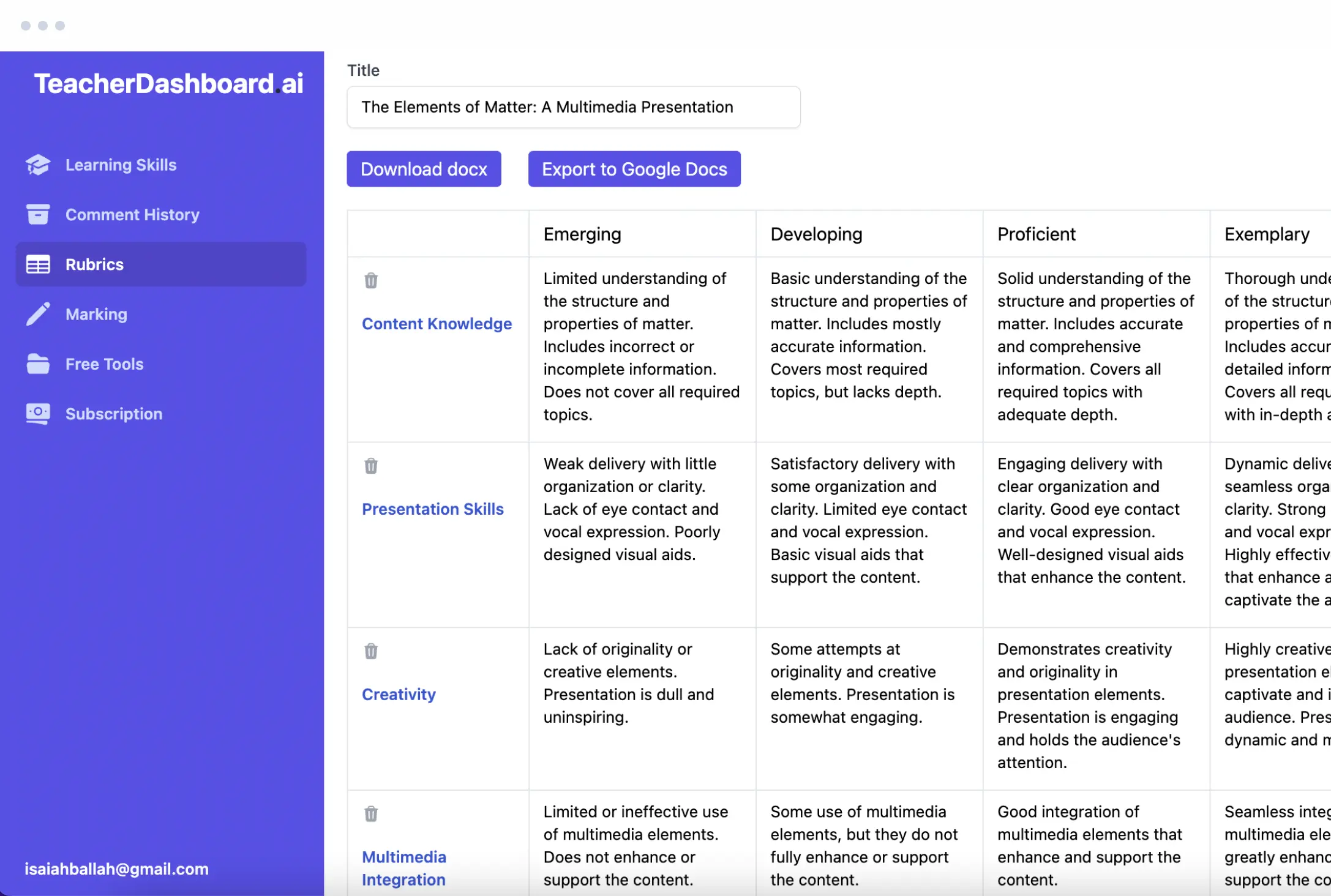 Rubric Generator, Mark Written Assignments, Report Card Subject Comments and Learning skill Comment Writer. Save hours with our AI tools for teachers.